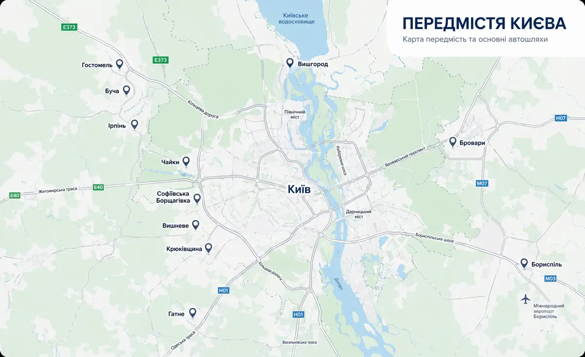 Поняття «під Києвом» часто вводить в оману. На карті всі передмістя виглядають близько, але в реальному житті різниця між ними — це десятки хвилин щодня. При виборі квартири важливо оцінювати не кілометри, а фактичний час доїзду.